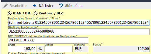 Gehen Sie im Detailformular auf „Bearbeiten“ und kürzen Sie den Namen des Begünstigten um die Anzahl der Sonderzeichen, wenn z.B. ein Umlaut vorhanden ist, um ein Zeichen.
