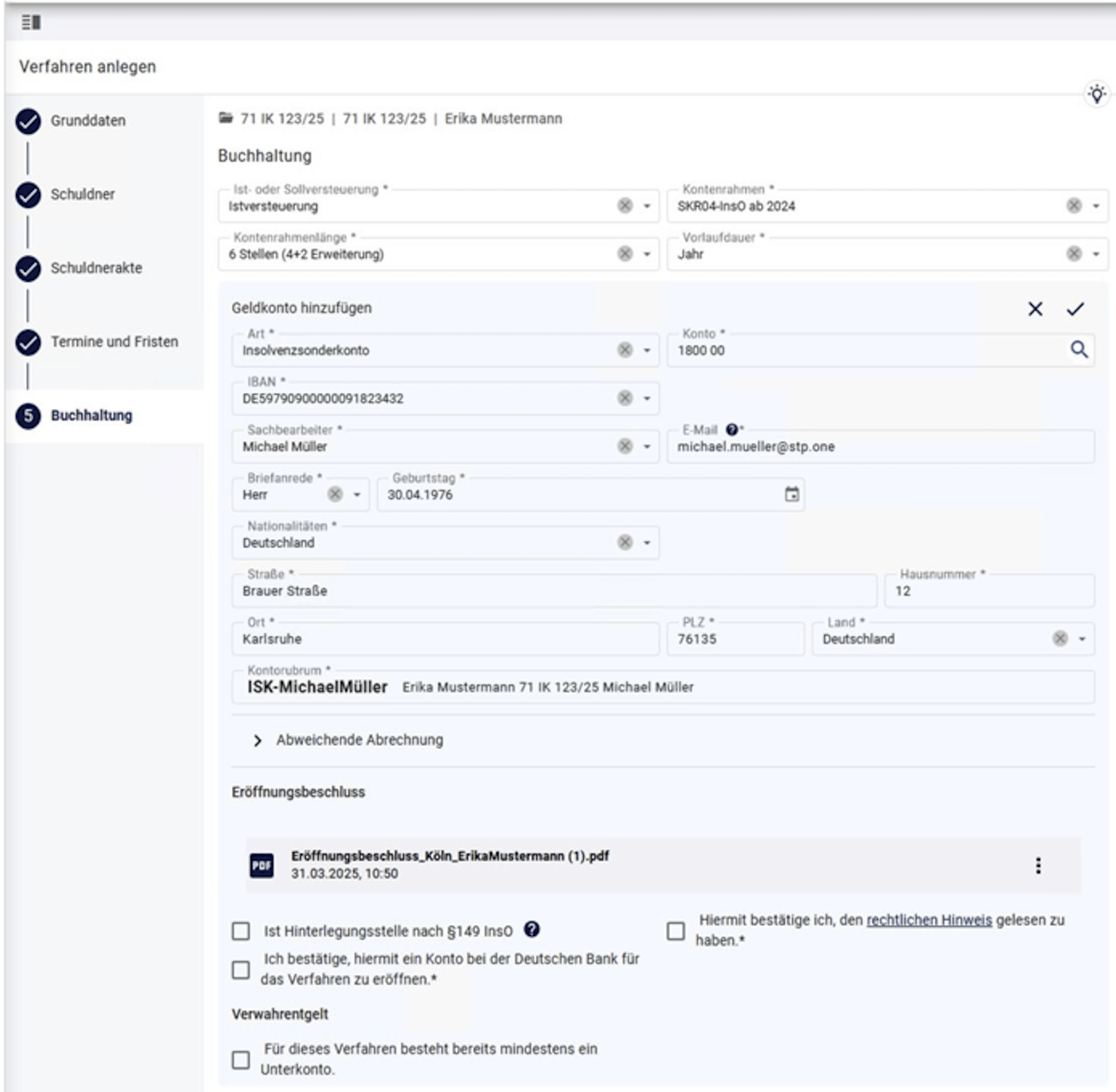 Ein besonderes Highlight: die direkte Integration der Deutsche-Bank-API. Damit können Sie Treuhand- und Insolvenzsonderkonten direkt aus dem Verfahrensanlageassistenten heraus digital eröffnen – ganz ohne Medienbruch oder manuelle Zwischenschritte.